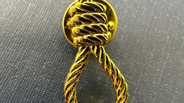Közelkép az izraeli Knesszet szélsőjobboldali tagjai által a halálbüntetésről szóló törvényjavaslattal kapcsolatos meghallgatásokon viselt hurkos hajtóka tűről. (Itamar Ben-Gvir iroda) Mélyen rasszistának nevezik