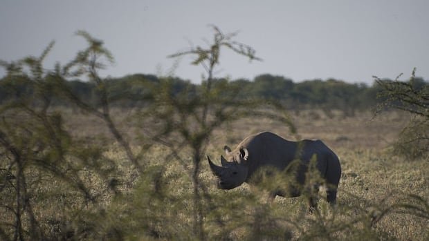A 2015 -ös fájlfotóban a Namíbia Etosha Nemzeti Parkban a veszélyeztetett fekete orrszarvú legelései. A parkot jelenleg egy hatalmas tűzoltásba vonják be. (Martin Bureau/AFP a Getty Images -en keresztül)