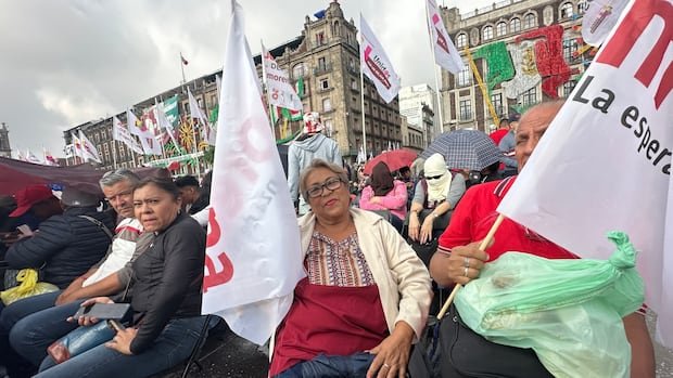 Mario Raul Saurez, 68 éves, egy fiatal tüntetési csoport része, amely ellenzi a Sheinbaumot és a kormányzó Morena pártot. Raul Saurez a Nemzeti Palota közelében egy köztérben állt tiltakozó táborban. (Jorge Barrera/CBC)