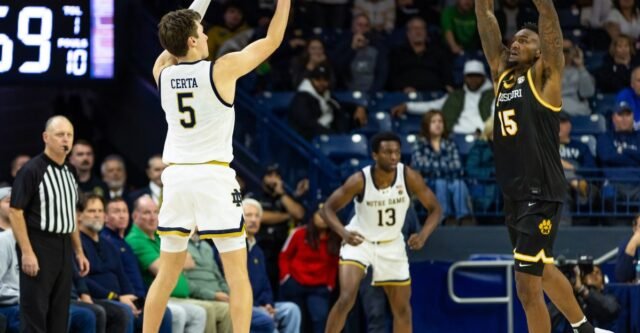 A játék legsarkalatosabb sorozata a szabályozás gyengülő pillanataiban jött létre. Cole Certa egy mély 3-ast ütött, így a Notre Dame 72-69-re vezet 17 másodperccel a rendes vége előtt. A másik oldalon Jacob Crews rohant meg – és kihagyott – egy hárompontost a billentyű tetejéről, a kipattanót pedig az írek korrigálták. Markus Burton lőtt pár szabaddobást, Mizzou pedig kifutott az időből a csodás visszatérésre.