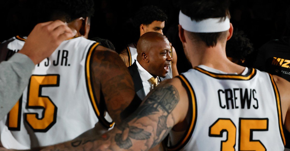 A missouri férfi kosárlabda vezetőedzője, Dennis Gates beszél csapatával a Tigers Prairie View A&M elleni mérkőzése előtt 2025. november 17-én, hétfőn a kolumbiai Mizzou Arénában. Hannah Henderson/Rock M Nation