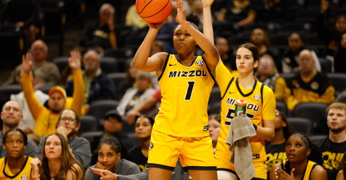 Shannon Dowell, a Missouri gárdája hárompontos bedobást kísérel meg a Tiger’s Central Arkansas elleni meccsén 2025. november 3-án, hétfőn a columbiai Mizzou Arénában. Hannah Henderson/Rock M Nation