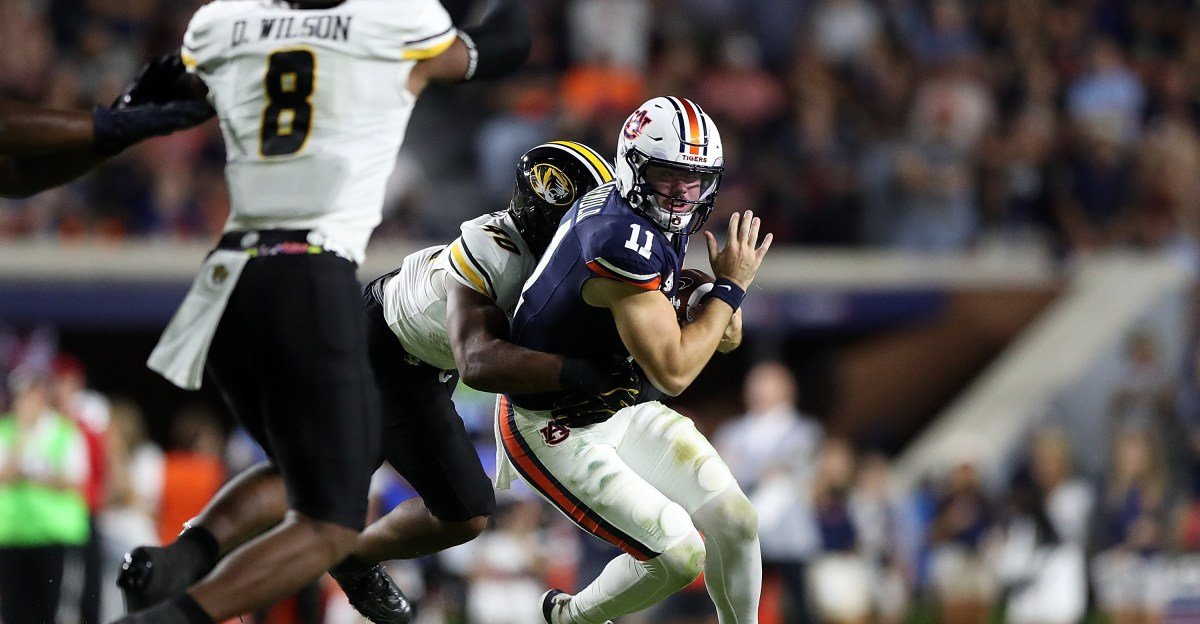 Az Auburn Tigers hátvédjét, Jackson Arnoldot (11) menesztette a Missouri Tigers defensive end Zion Young (9), miközben az Auburn Tigers a Missouri Tigers ellen lép pályára az Auburn állambeli Jordan-Hare Stadionban 2025. október 18-án, szombaton. A Missouri Tigers legyőzte a Tigers-17 Au233 csapatát. Jake Crandall/ Hirdető / USA TODAY NETWORK via Imagn Images