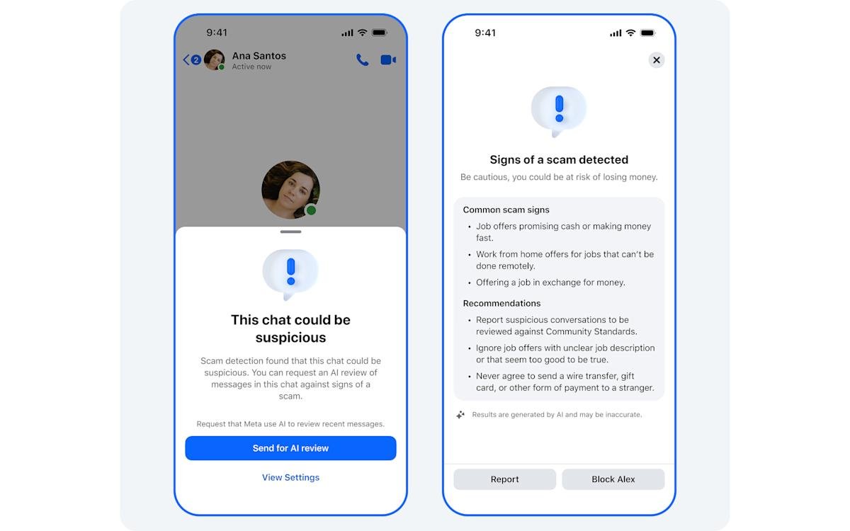 A vállalat a fejlett átverésészlelő eszközöket is teszteli a Messenger mobilos csevegéseiben. Amikor a felhasználó egy esetlegesen átverő üzenetet kap, egy figyelmeztető üzenet jelenik meg, amely azt jelzi, hogy az üzenet gyanús, és továbbíthatja a Metának AI felülvizsgálatra. Ha a Meta AI potenciális átverést észlel, megjeleníti a felhasználónak a gyakori átverési jelek listáját, például pénzért cserébe adott állásajánlatokat, gyors készpénzt ígérő állásajánlatokat és otthonról történő munkát olyan munkákra, amelyeket távolról nem lehet elvégezni. Arra is emlékezteti a felhasználókat, hogy ne utaljanak át pénzt vagy küldjenek ajándékutalványokat, amelyek nagyon gyakori módszerek, amelyeket a csalók arra használnak, hogy pénzt lopjanak el áldozataiktól. Az oldal alján a felhasználóknak lehetőségük lesz bejelenteni és letiltani azt a fiókot, amelyiktől az üzenetet küldték.