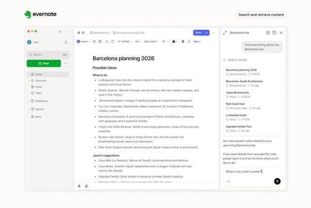 Az első új funkciók közül az első hajlító kanál, amelyet ma vezetnek be, AI asszisztensnek hívják. A Simionato úgy írja le, hogy az Evernote -ban chatgpt. Nem meglepő, mióta a cég együttműködött az Openai -val, hogy elkészítse. Mint valószínűleg kitalálhatja, az AI asszisztens segítségével keresheti a jegyzeteket és a notebookokat, de az eszköz hasznossága túlmutat. Ez lehetővé teszi, hogy kapcsolatba lépjen a dokumentumaival és nyomon követési kérdéseket tegyen fel. Az AI asszisztens új tartalmat is generálhat, és eldöntheti, hogyan integrálódik az általa létrehozott jegyzetekbe és notebookjaiba. A bemutatómban a Simionato AI asszisztenst használta a repülési jegyek számának hozzáadásához egy feljegyzéshez, amelyet a közelgő Spanyolországba tett utazáshoz szentelt. Az idő múlásával a hajlító kanál azt tervezi, hogy az AI asszisztens erősebbé teszi, és a vállalat azon dolgozik, hogy lehetővé tegye a chatbot címkéket a jegyzetekhez, és több dokumentumon keresztül több dokumentumon keresztül hajtsa végre az ömlesztett műveleteket.