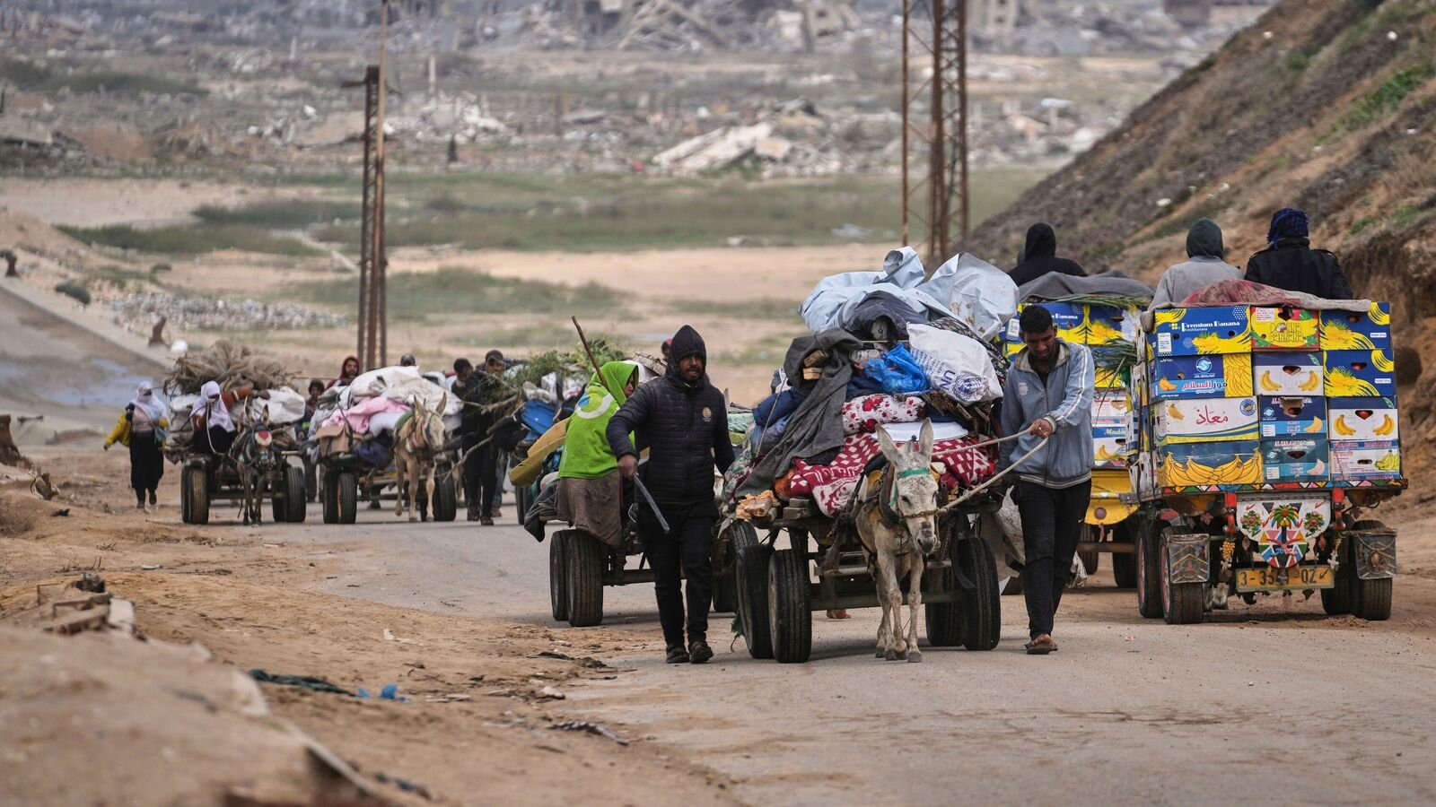 Ahogy az izraeli erők előrehaladtak Gázában, a lakóhelyüket elhagyni kényszerült palesztinok elmenekültek a terület északi részéből egy parti út mentén, pénteken, a holmik, tűzifa és más tételek hordozva a lóval rajzolt kocsikon.